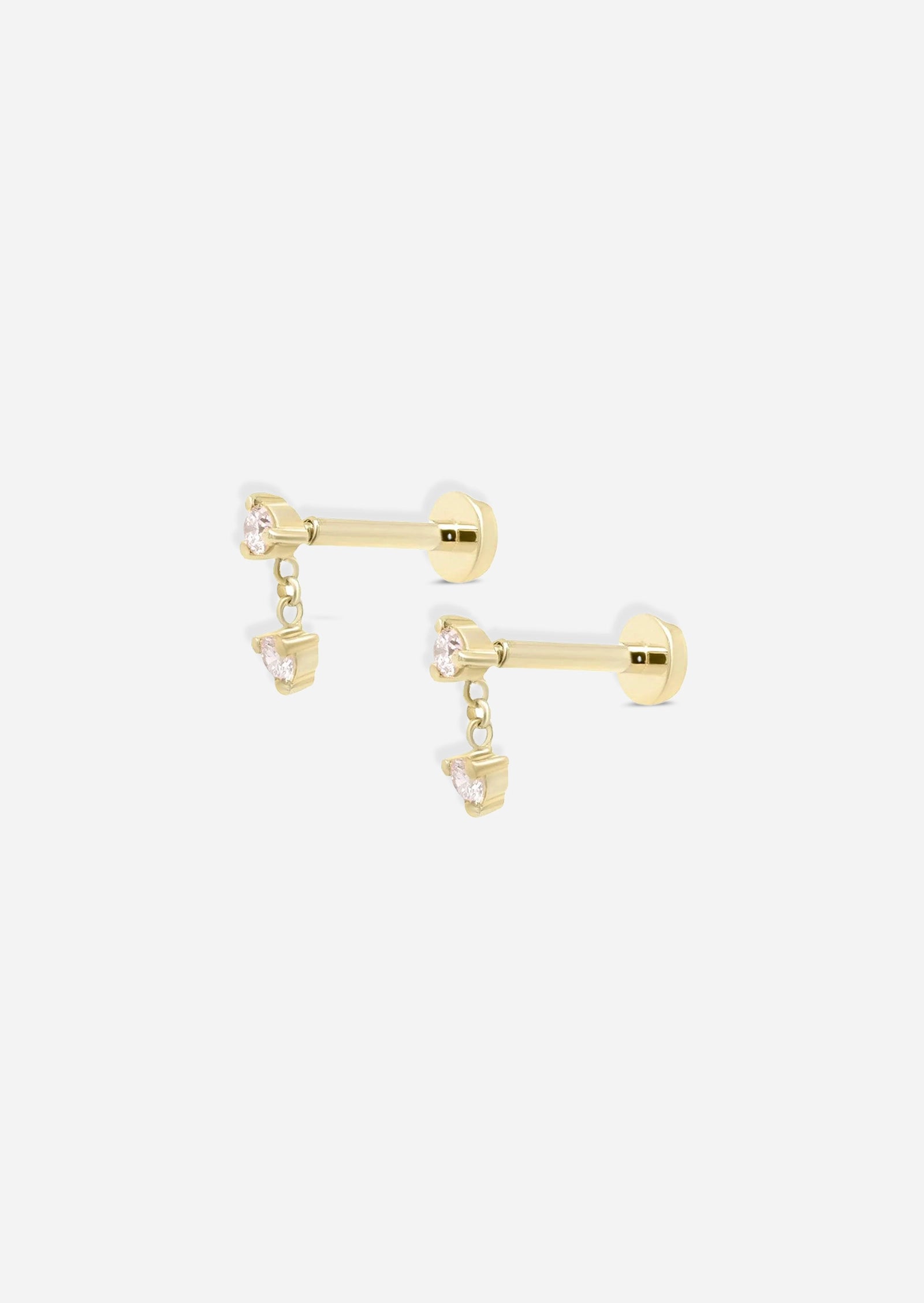 Double down on elevated essentials. Two prong-set diamonds connected by a small hanging chain for an added layer of elegance. We love wearing this piece in the second or third lobe piercing, helix, or flat piercing. Designed with our signature evil eye threaded flat back for extra comfort.
