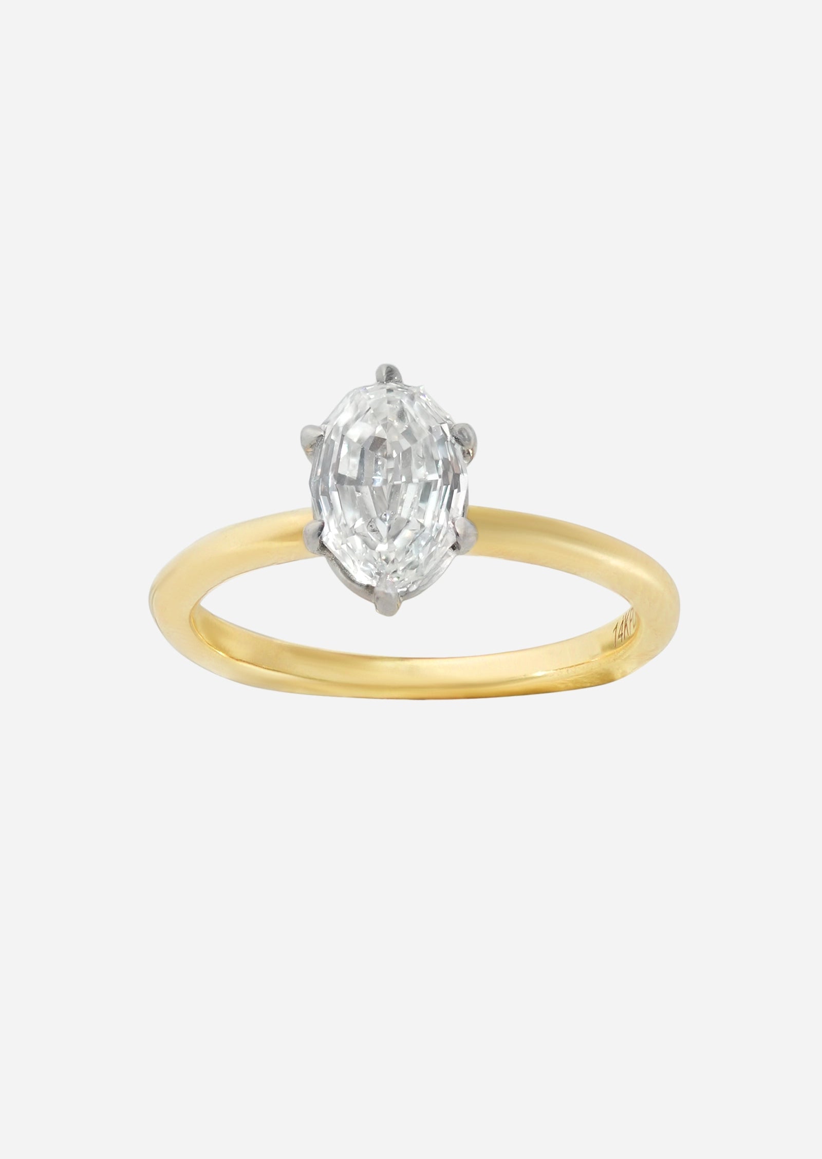 The D'Arcy ring orbits around a GIA Certified 1.50 carat Modified Oval Cut diamond of H color, VS1 clarity. Set in our signature European-style mount to prevent spinning, the stone rests securely in a antique design in both 14K Yellow Gold & Platinum. It's a Porter Lyons original, made with love in Louisiana.