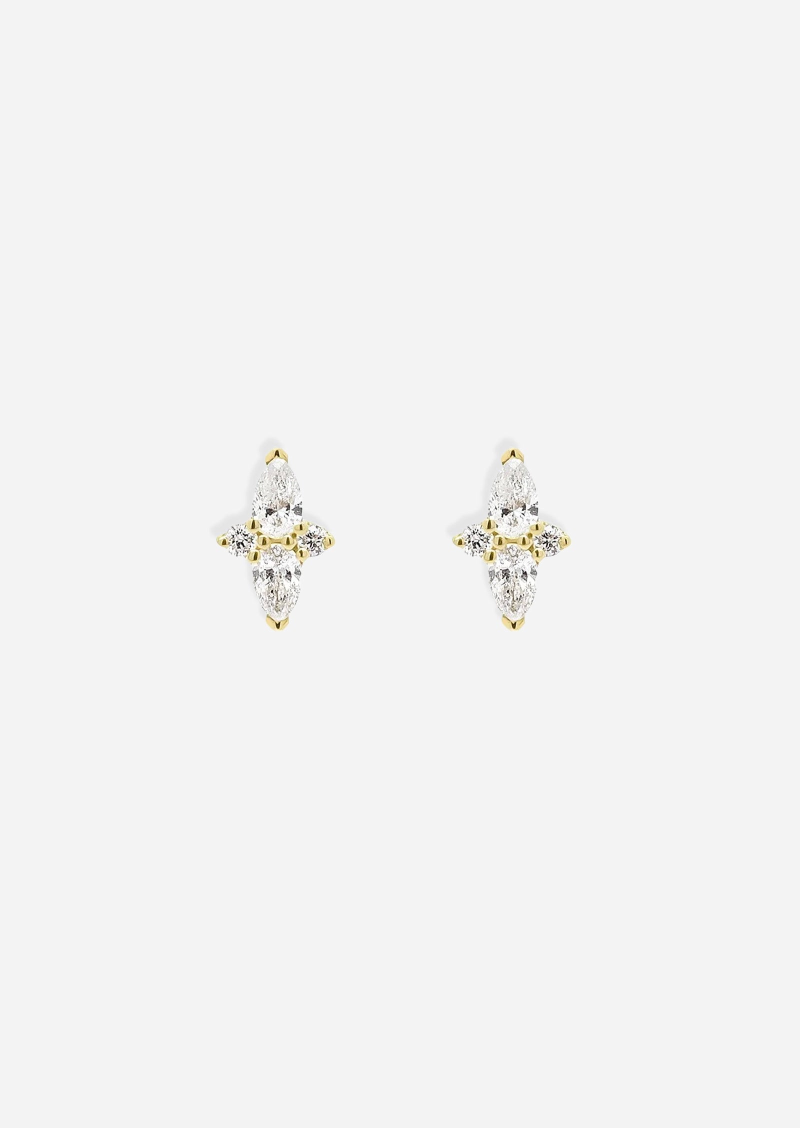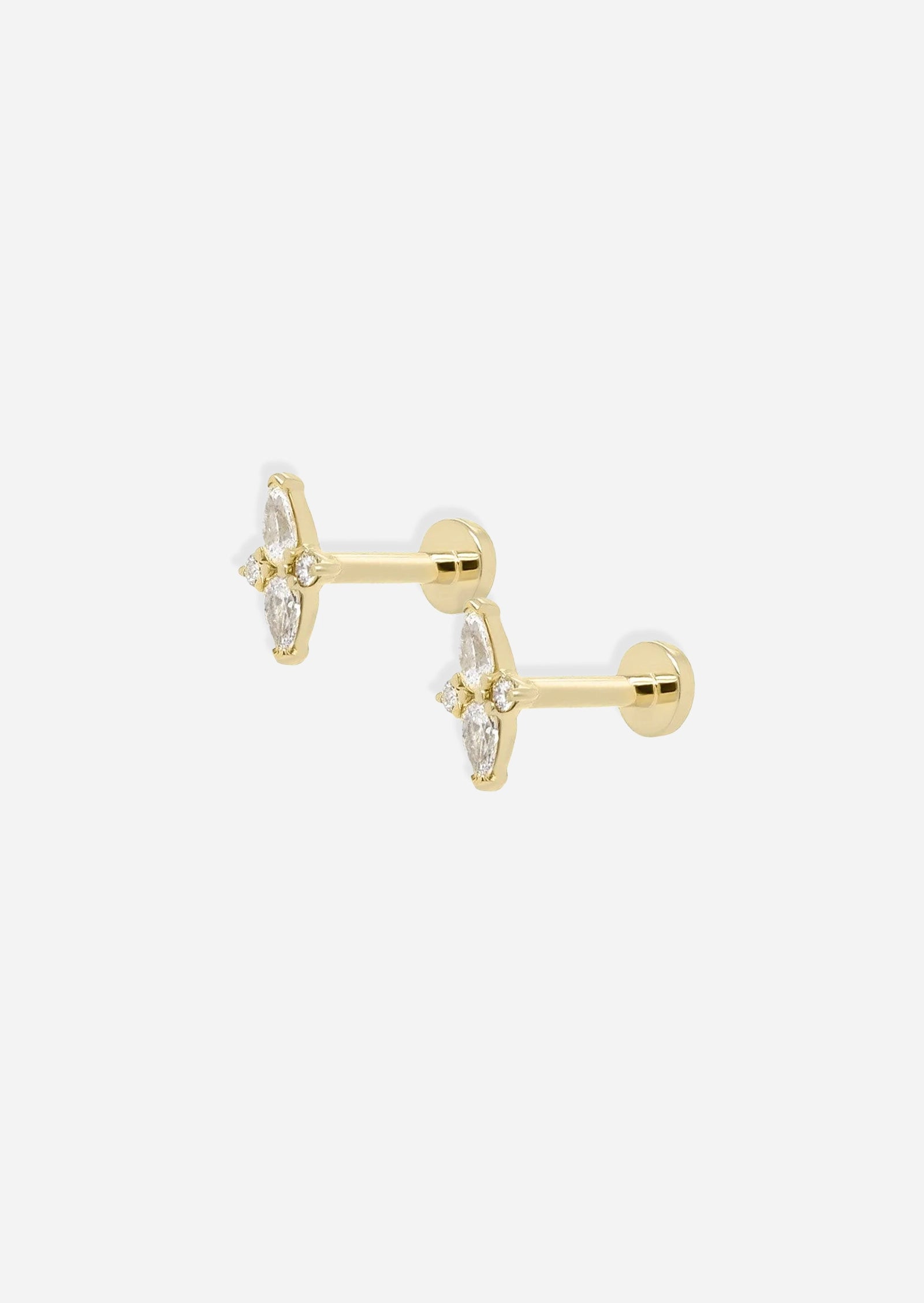 Two is better than one. This small but mighty stud features two opposing pear diamonds with complimenting round diamonds on either side. Wear this piece in the upper lobe for extra shine, or tucked away in the helix. Designed with our signature evil eye threaded flat back for extra comfort and daily wear.