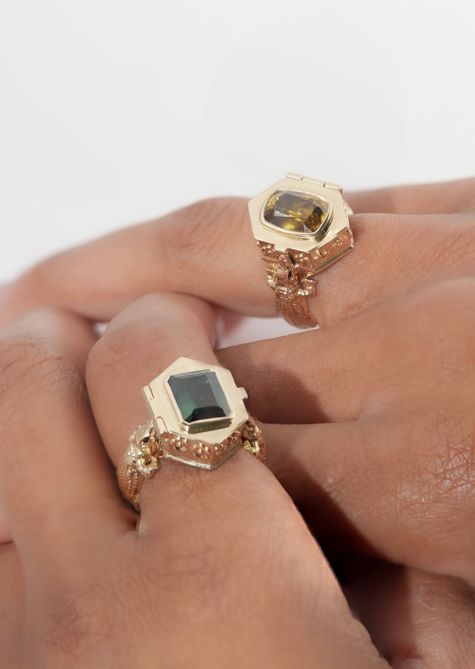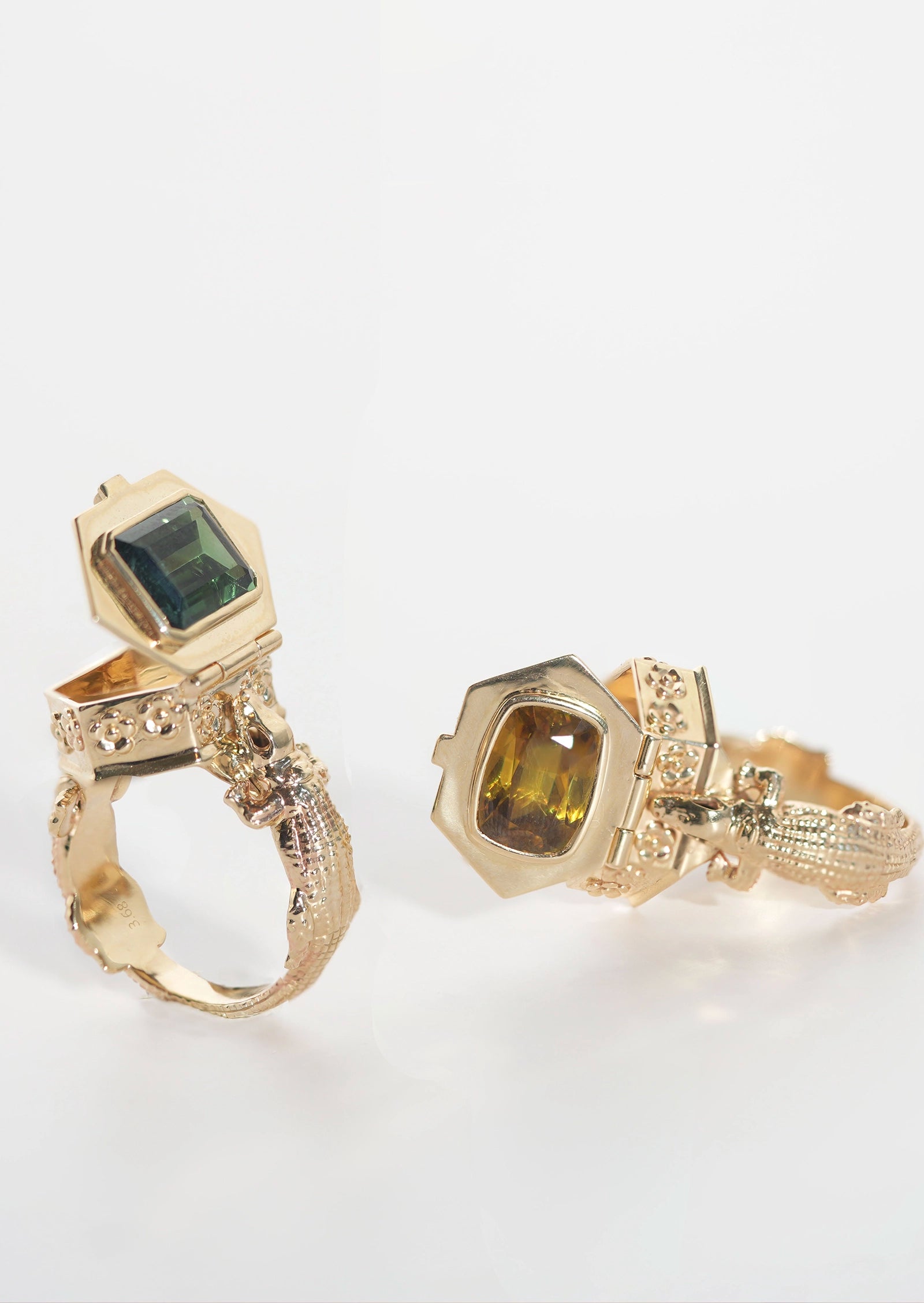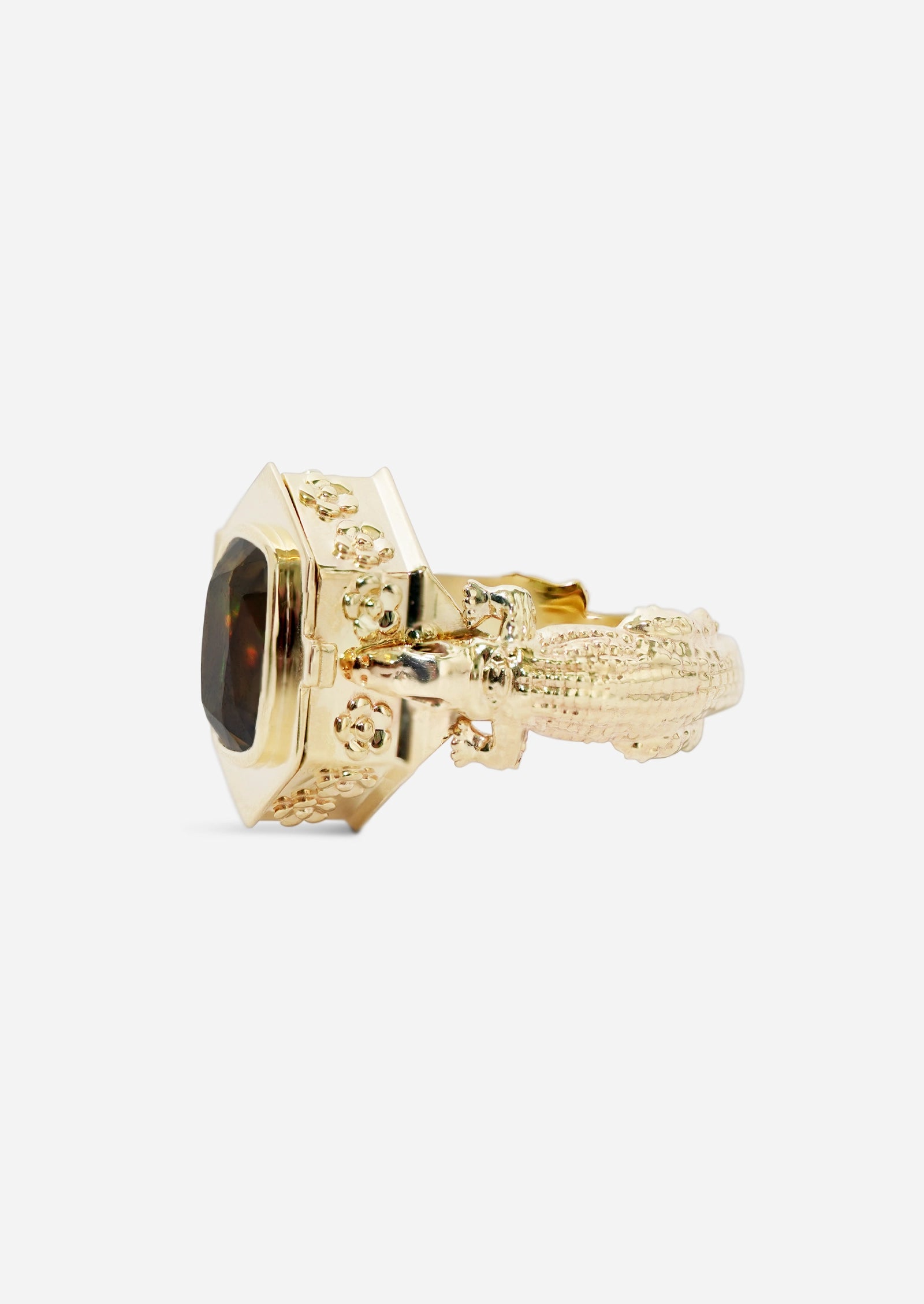 Death conquers all, but this one of a kind Funeral Ring allows you to carry something of your loved one close to you. The casket design hides a secret compartment, set with forget-me-not flowers on the side and skeletal alligator heads holding it. This one-of-a-kind sphene is believed to amplify creative energy and strengthen one's connection to divine wisdom.
