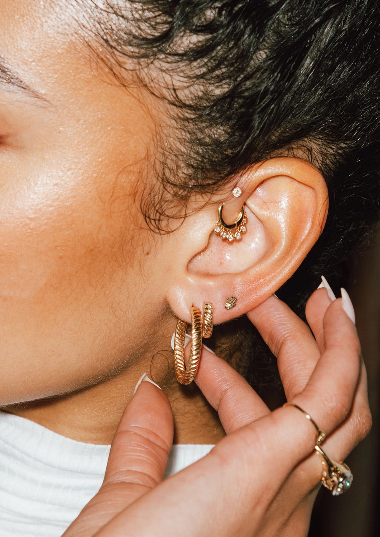 We love wearing this hoop in a second or third hole piercing, in the outer helix, or as a daith hoop.