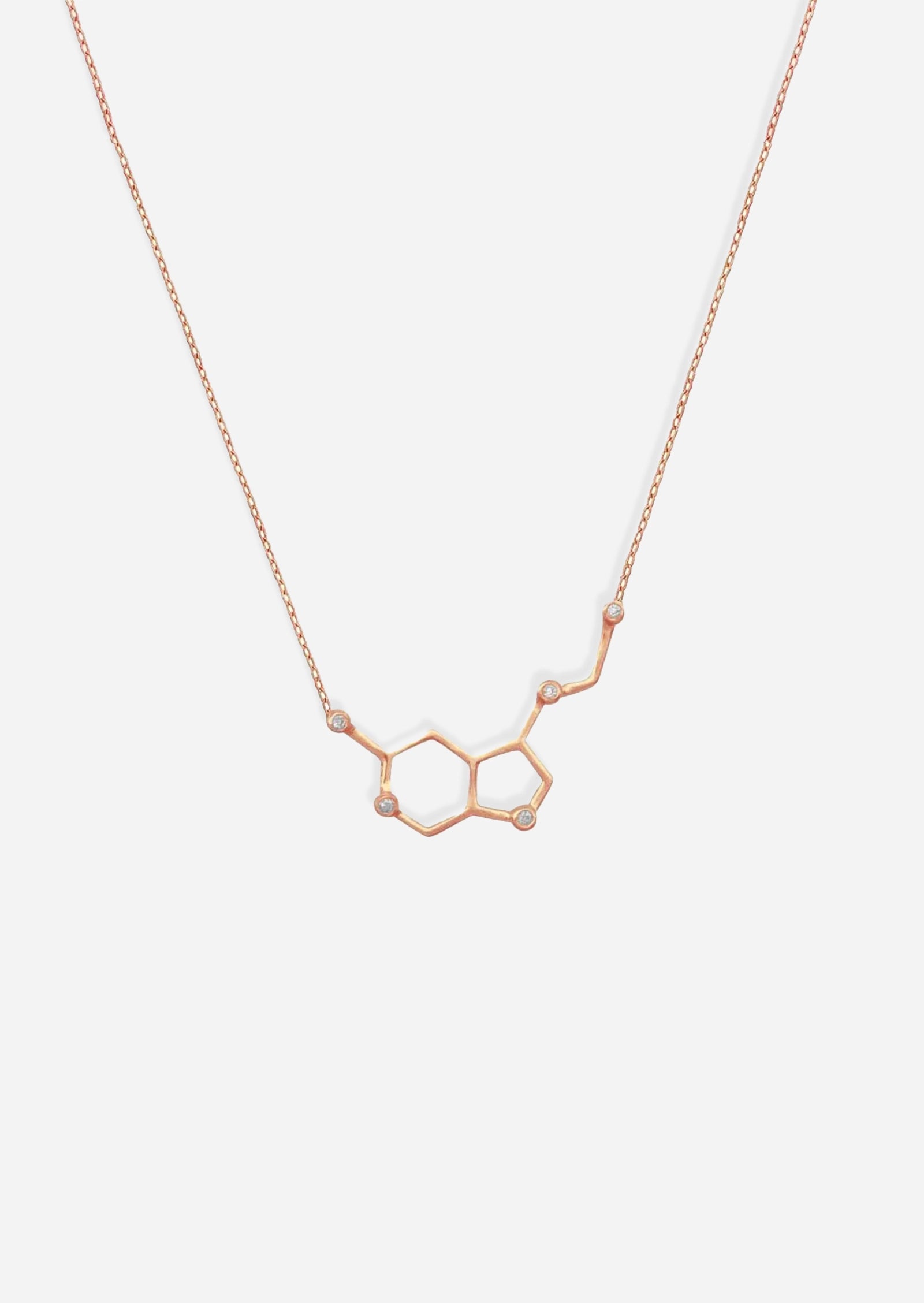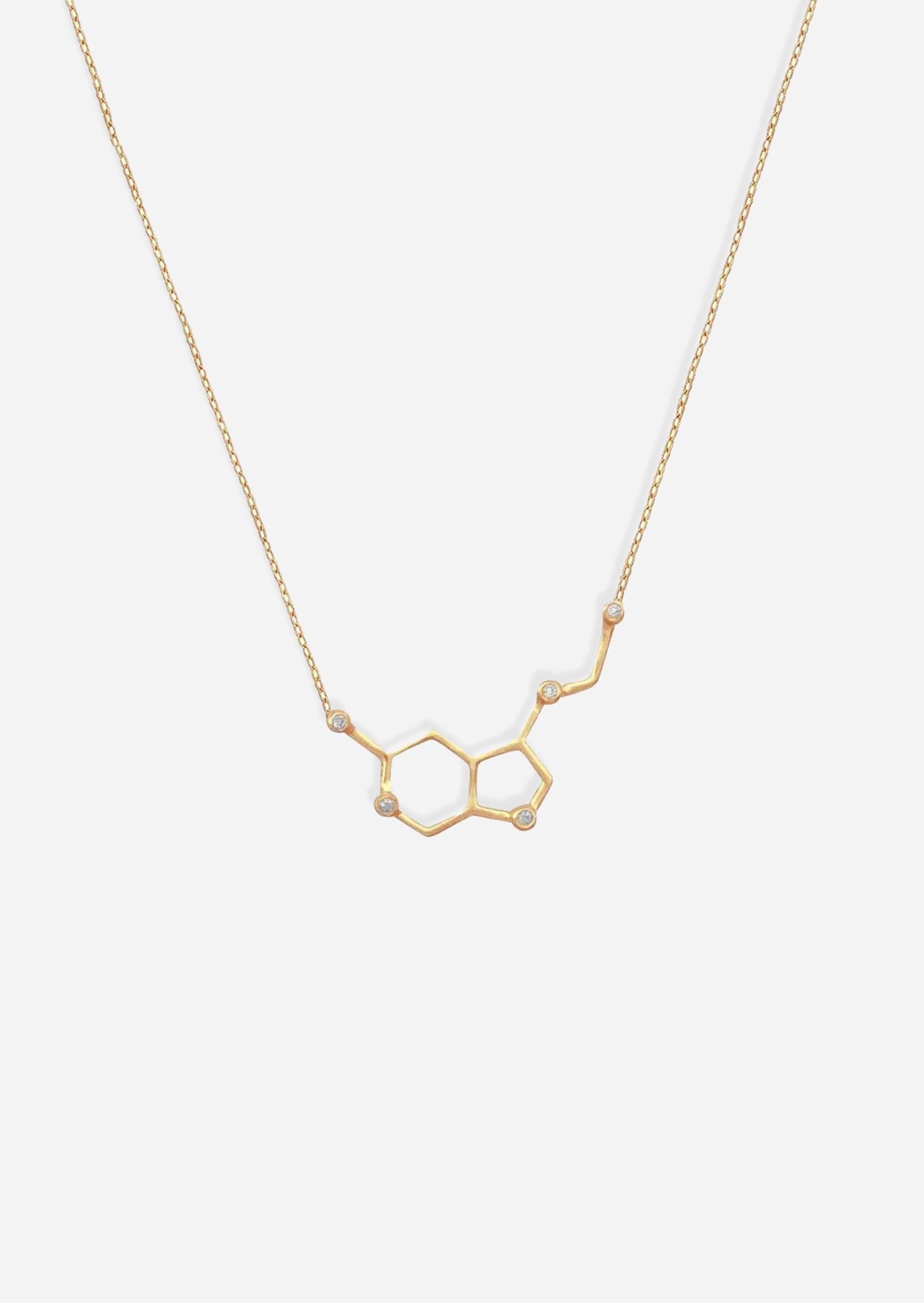 Bought the yellow gold serotonin necklace in store in New Orleans. A beautiful everyday necklace with cute diamonds detail and a great design. Goes with everything and I’ve gotten so many compliments on how unique and fun the serotonin molecule design is. Also, had a wonderful experience with the sales woman who was super friendly and helpful. Love this brand!!