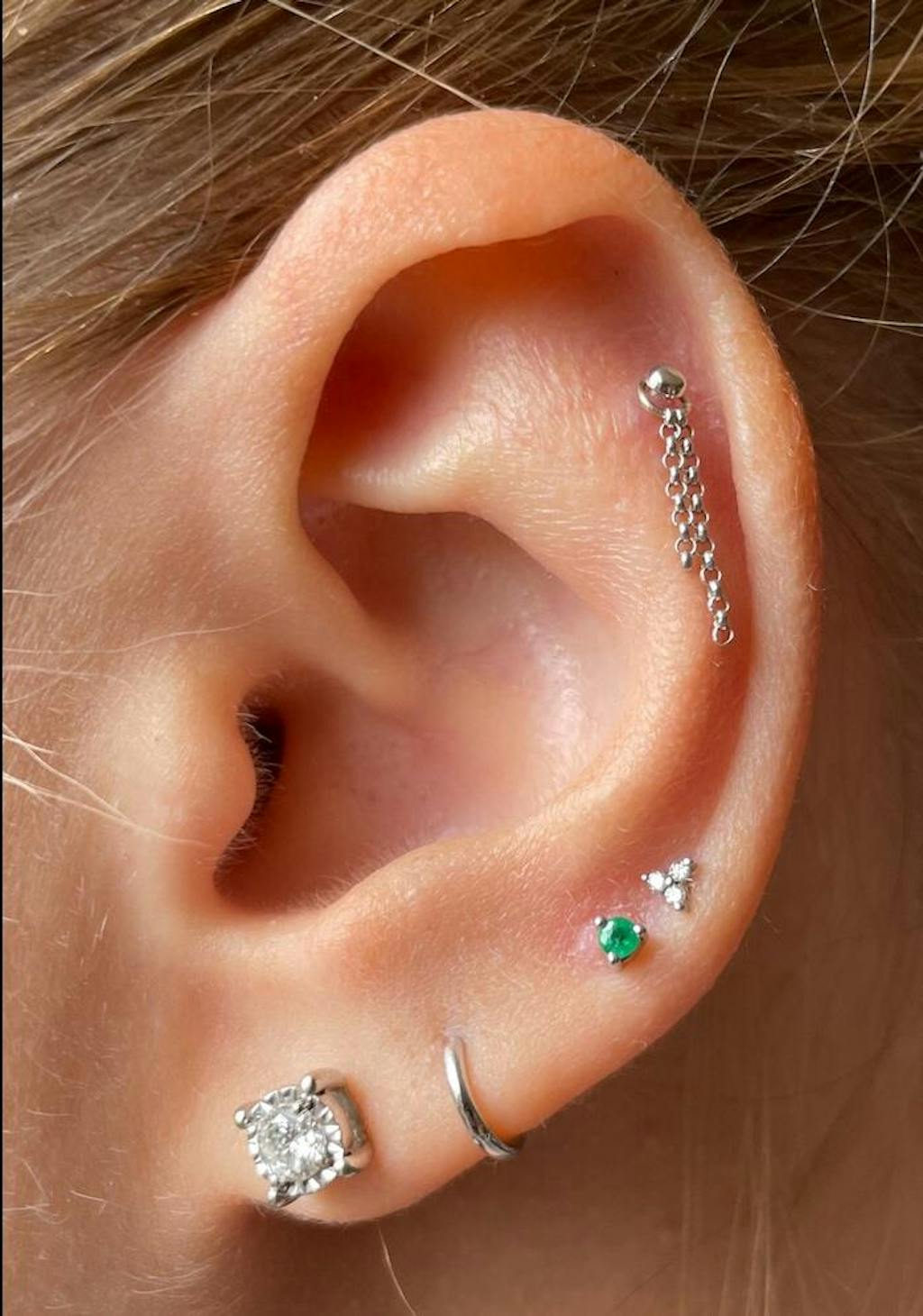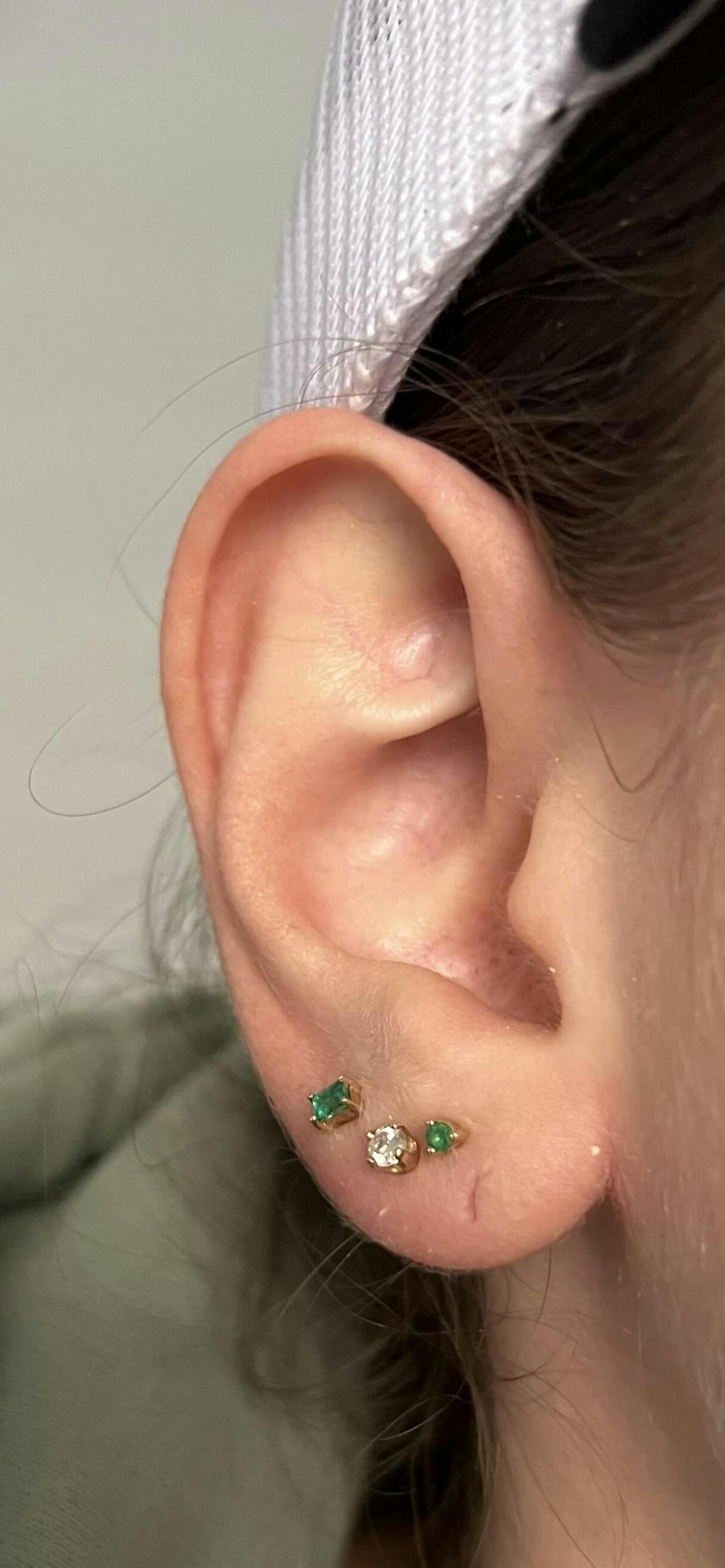 The petite emerald earring with our signature evil eye threaded flat back. The perfect dainty addition to your ear party to leave in and never take out.
