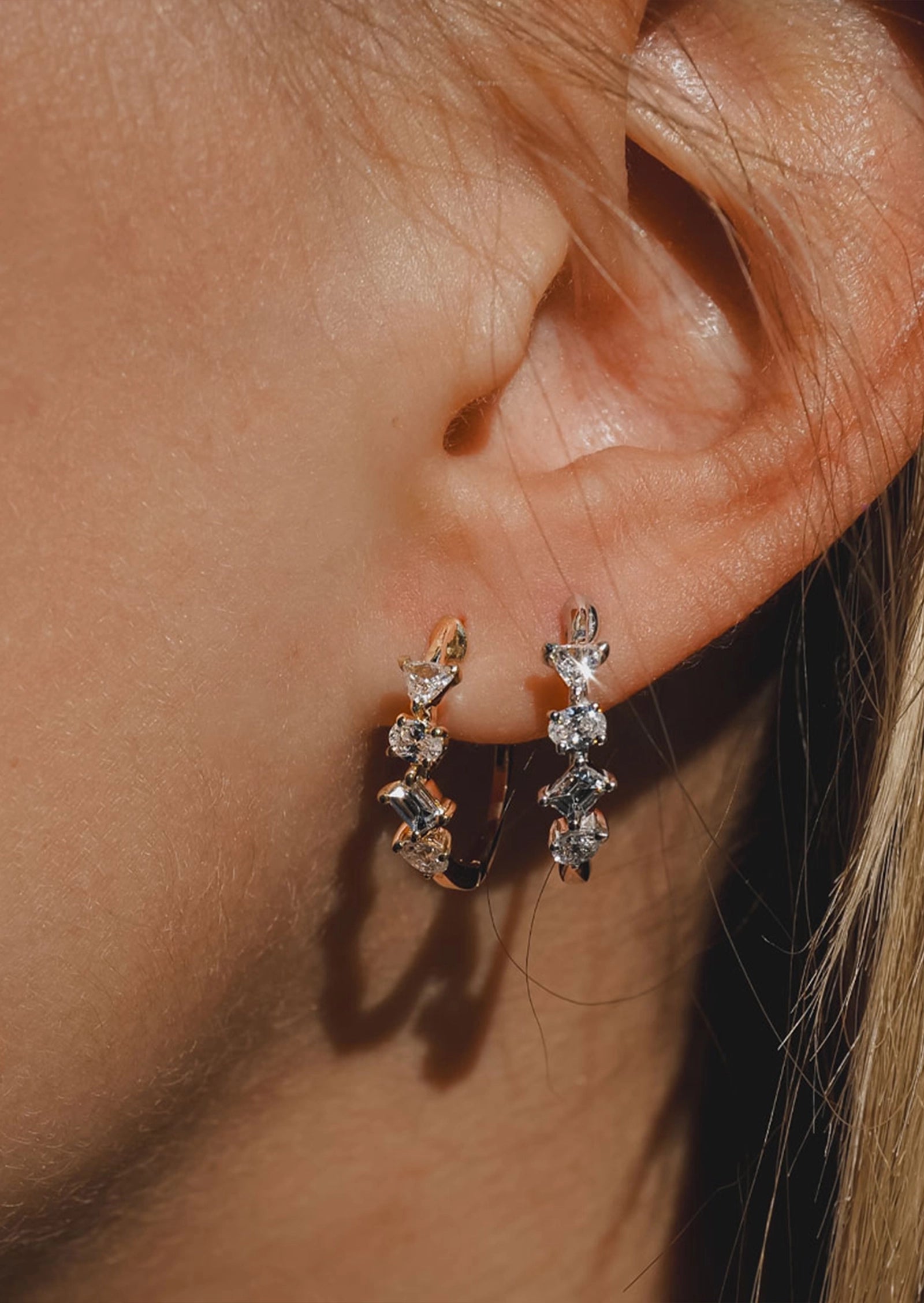 A untraditional take on a classic diamond hoop. This iconic piece is crafted with a multi-shape scattered diamond style, featuring a fancy-cut baguette, trillion, pear, and oval diamond. The perfect first hole hoop for everyday elegance.